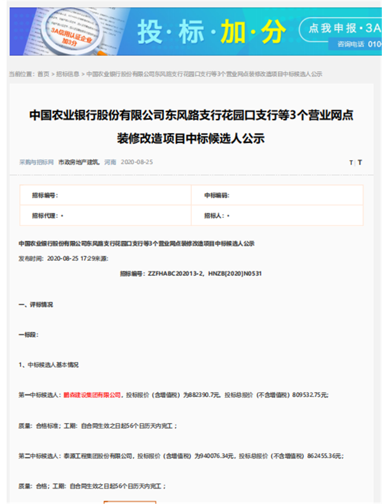 近日,公司佳音频传,连续中标两个项目:鹤壁市宝山循环经济产业集聚区智能化园区综合服务中心装修改造项目;中国农业银行股份有限公司东风路支行花园口支行等3个营业网点装修改造项目。